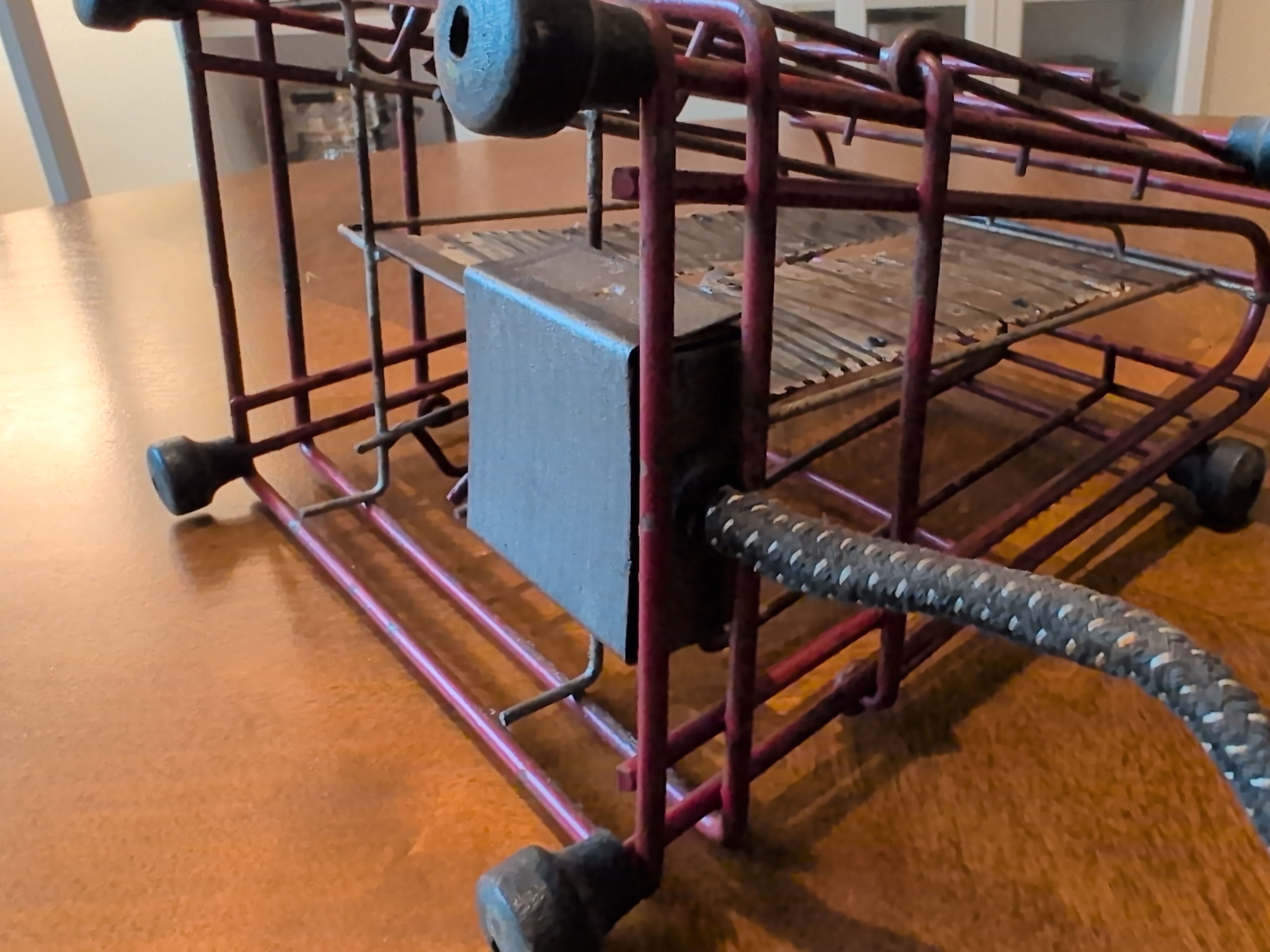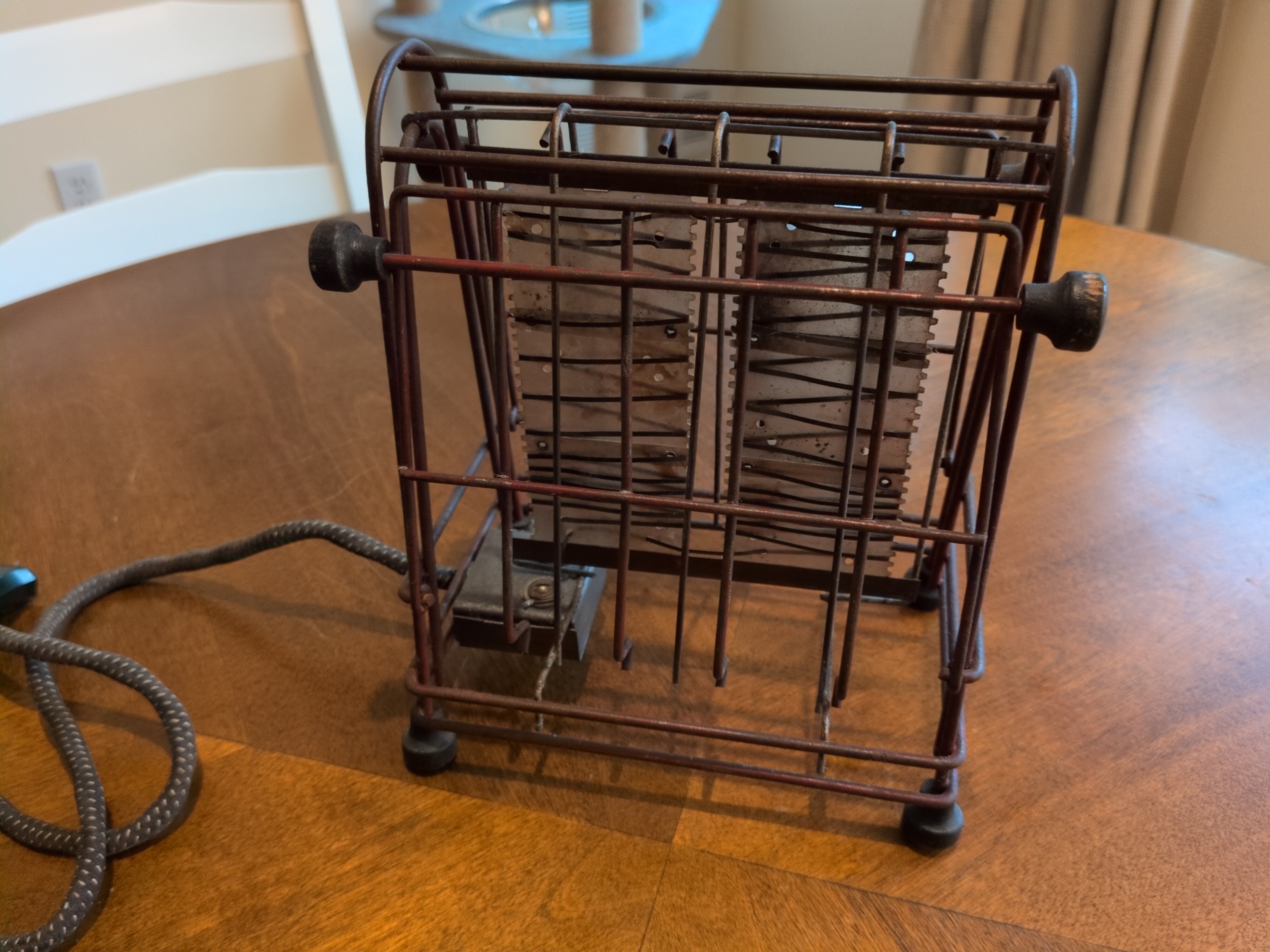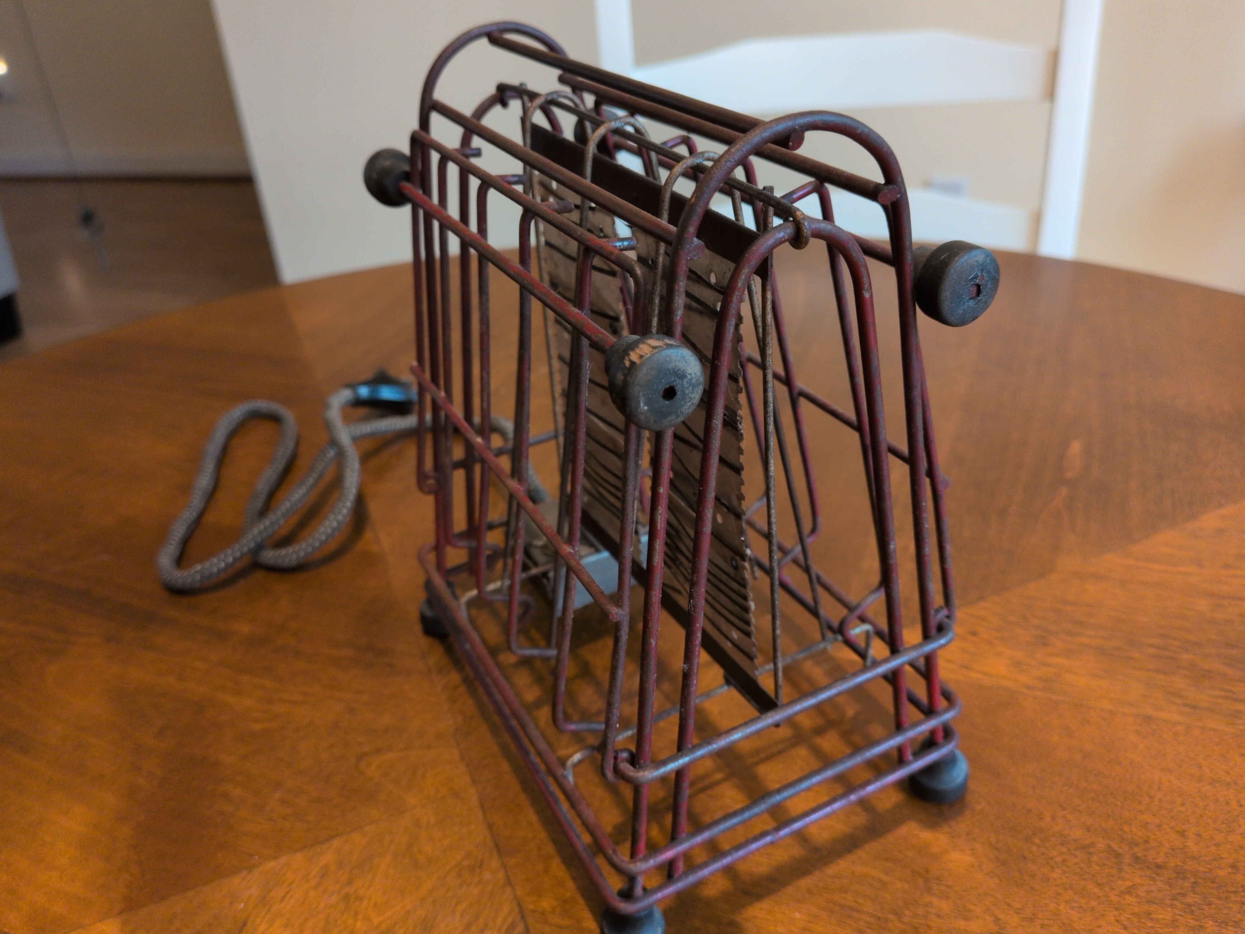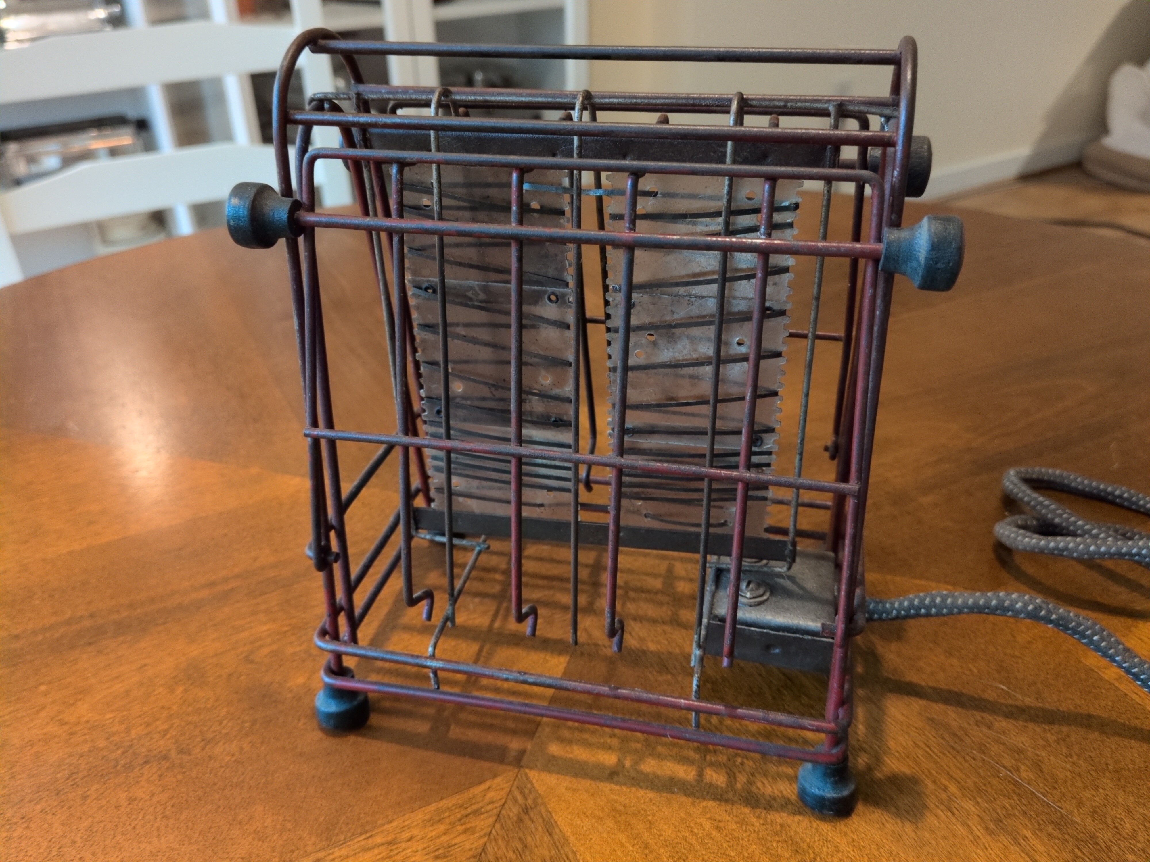 I have a lot of love for this toaster. It is true to say that it’s sparse. It’s true to say that it may be the actual least that an object can be to be considered a toaster, but there’s something specail about this one. It reminds me of the American Arts and Crafts movement, or something you’d see in a farmhouse. They have appeared in different colors. Some of them have bright red feet, but polished wire.