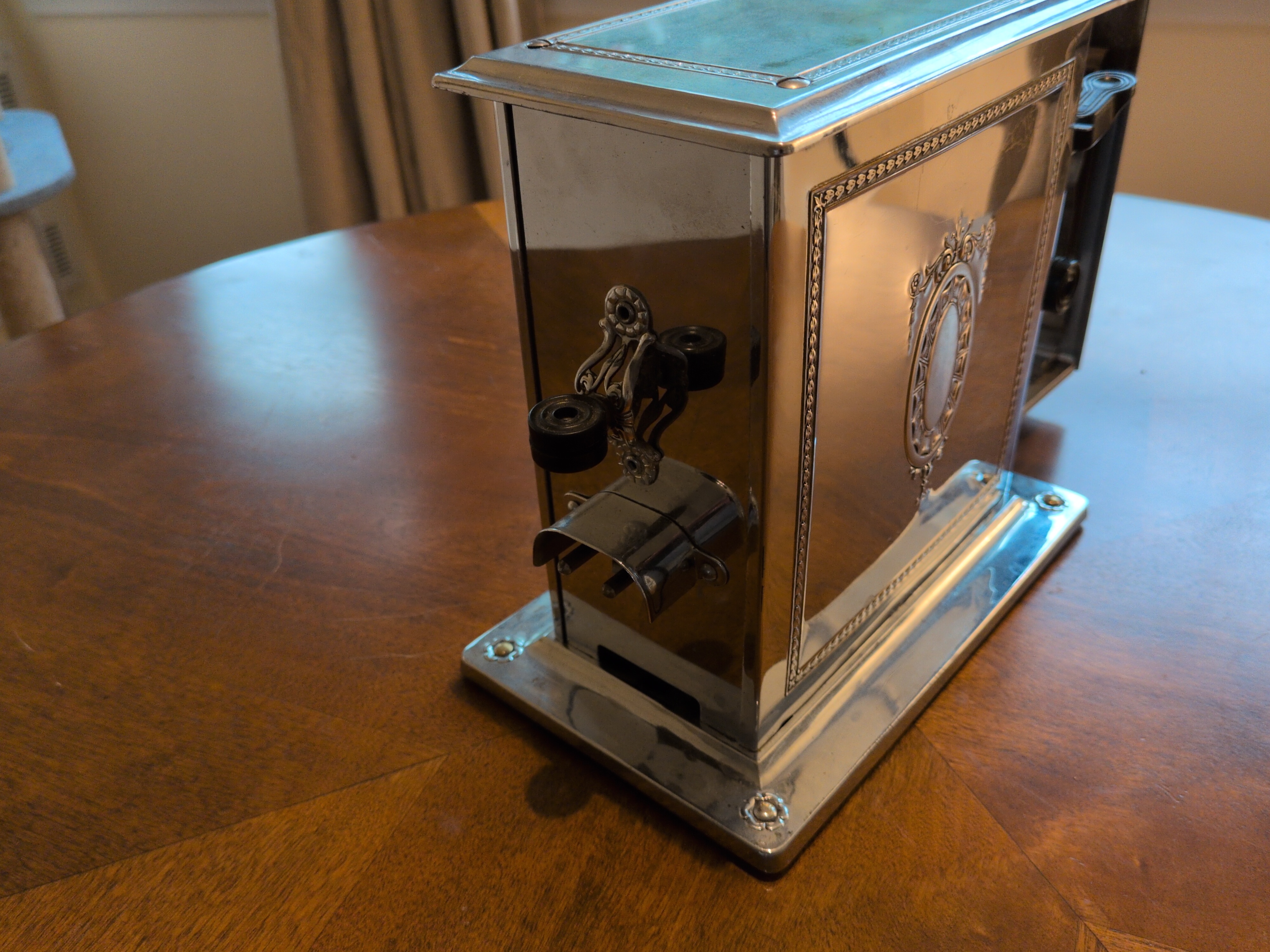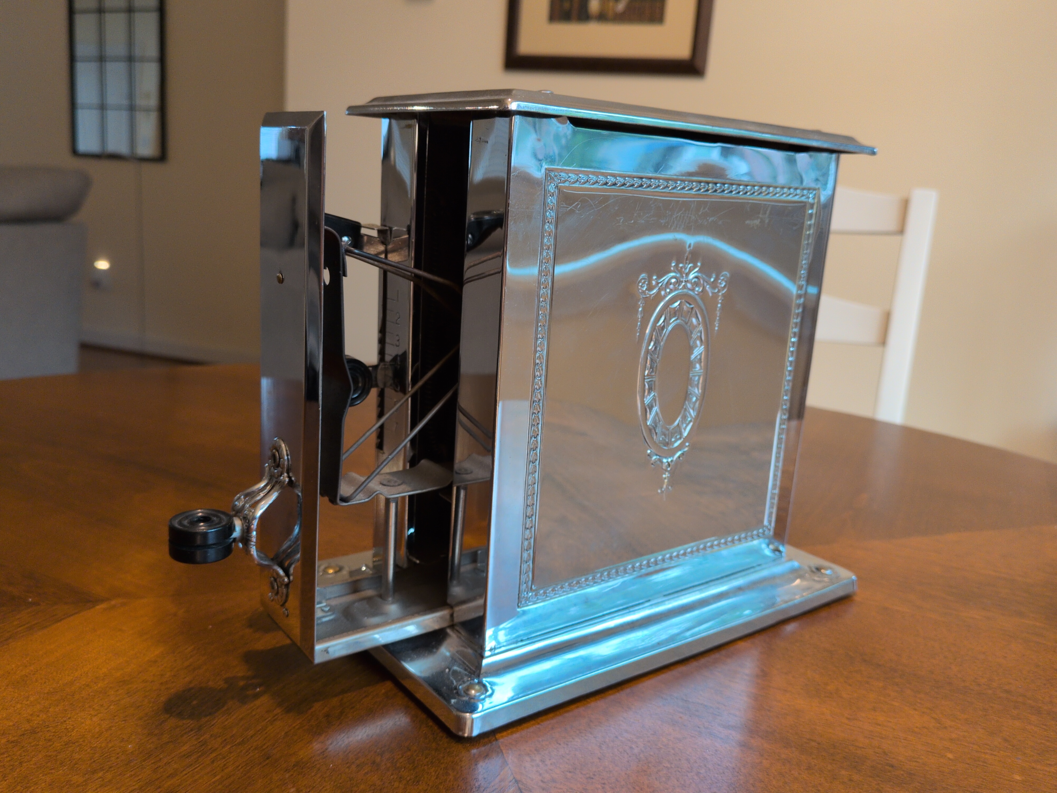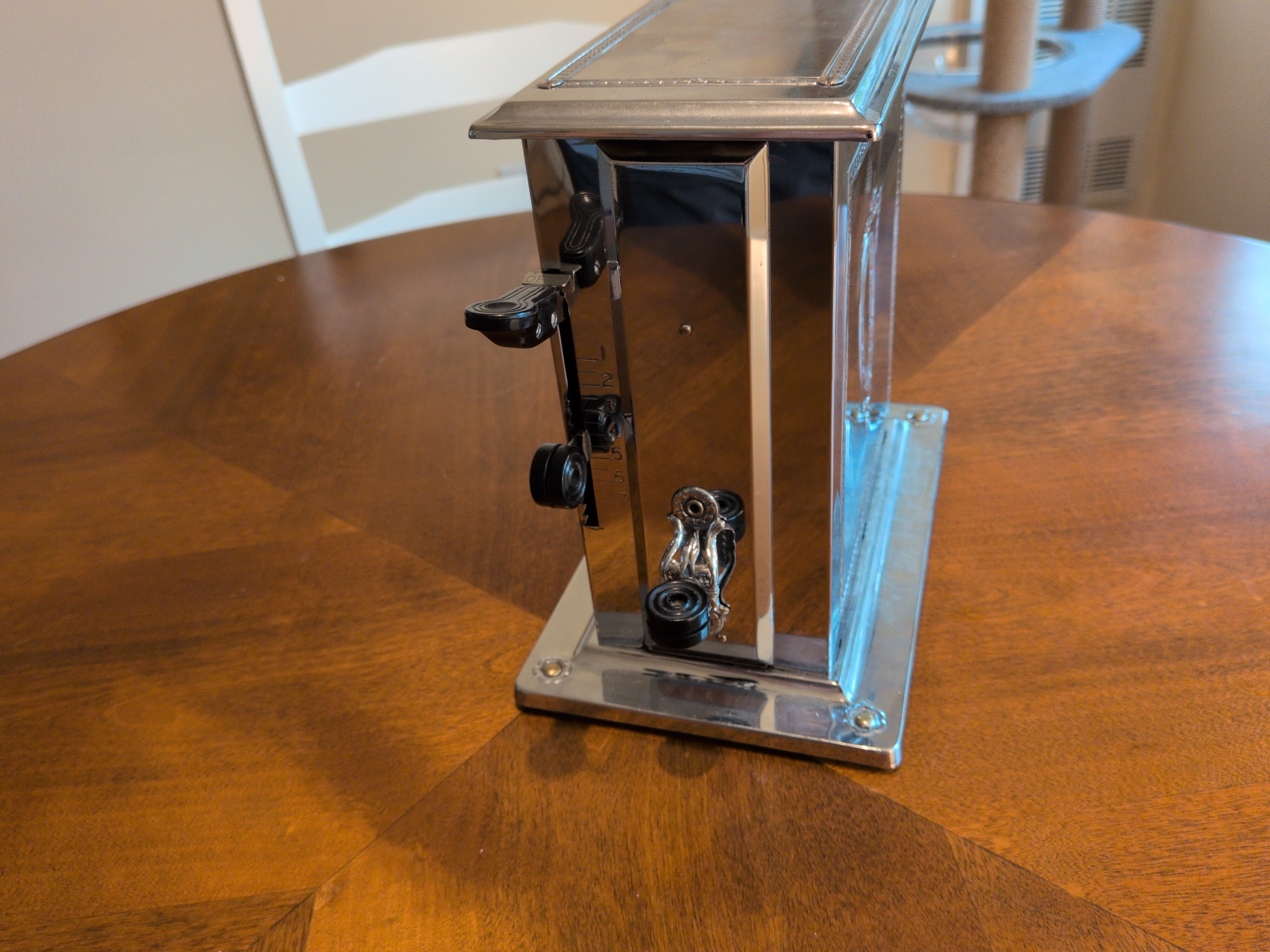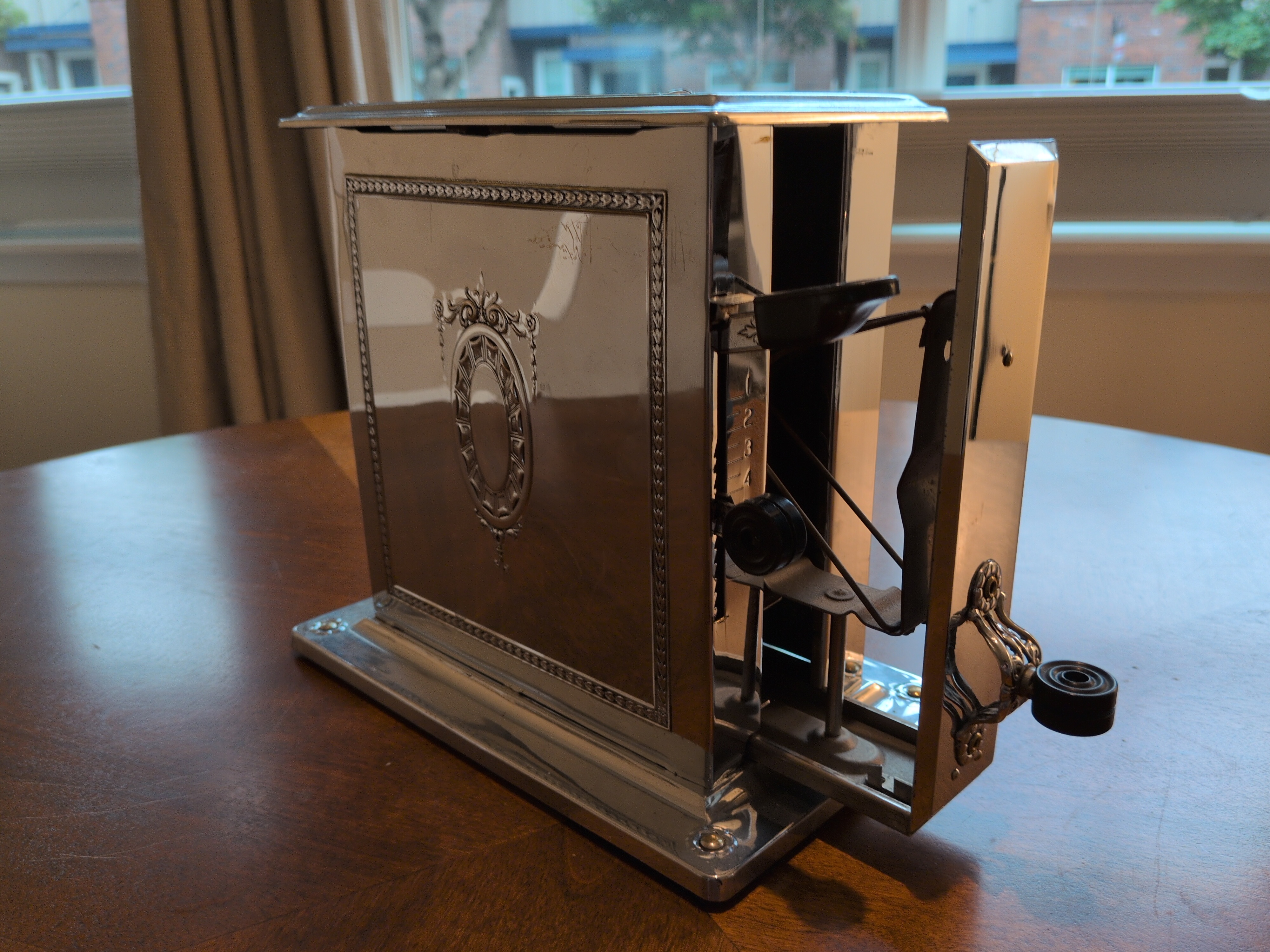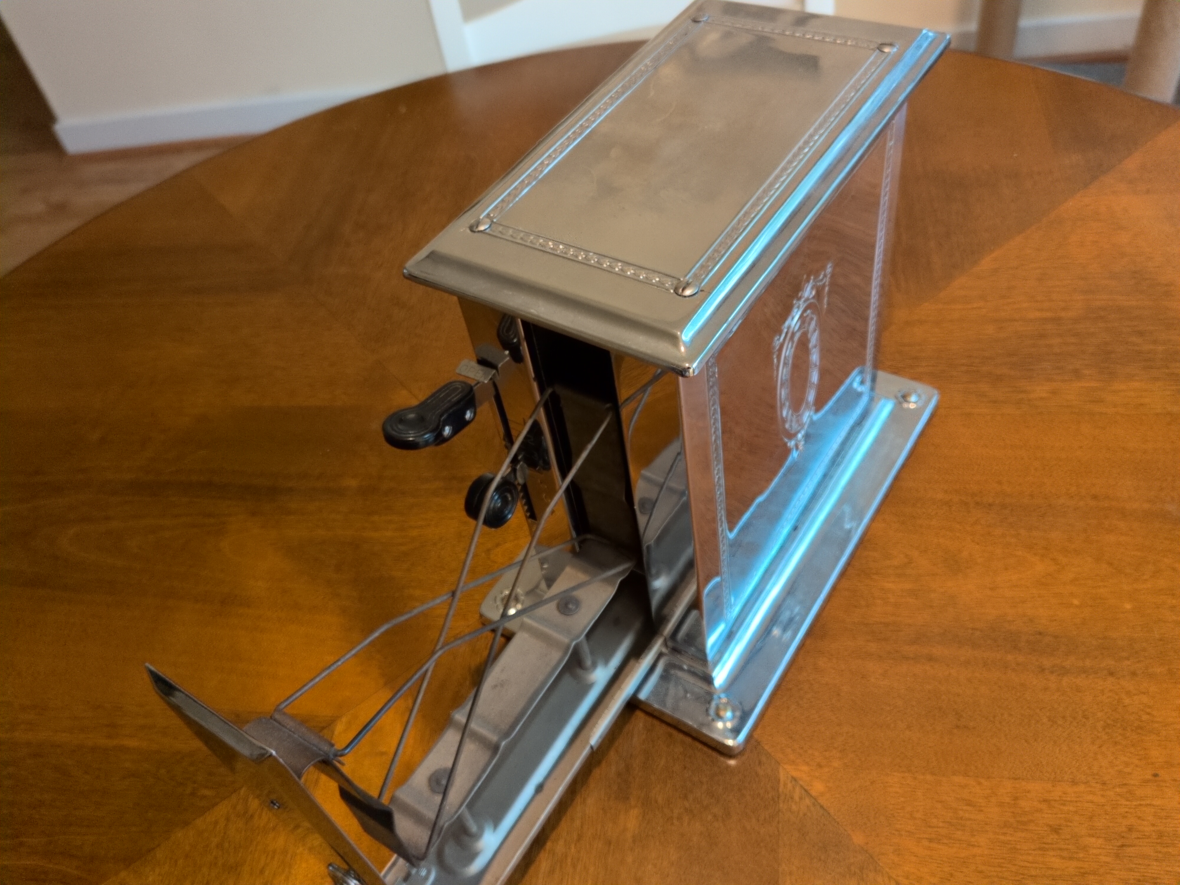 This is a decidedly beautiful and opulent single slice toaster. Its latching mechanism is particularly frustrating and finicky. It has a timer circuit, providing an automated means of cooking your bread. Assuming that the newspaper clipping is from when it was new in 1930, and adjusting for inflation to the time of this writing, this toaster was worth roughly $338 in today’s money 😮