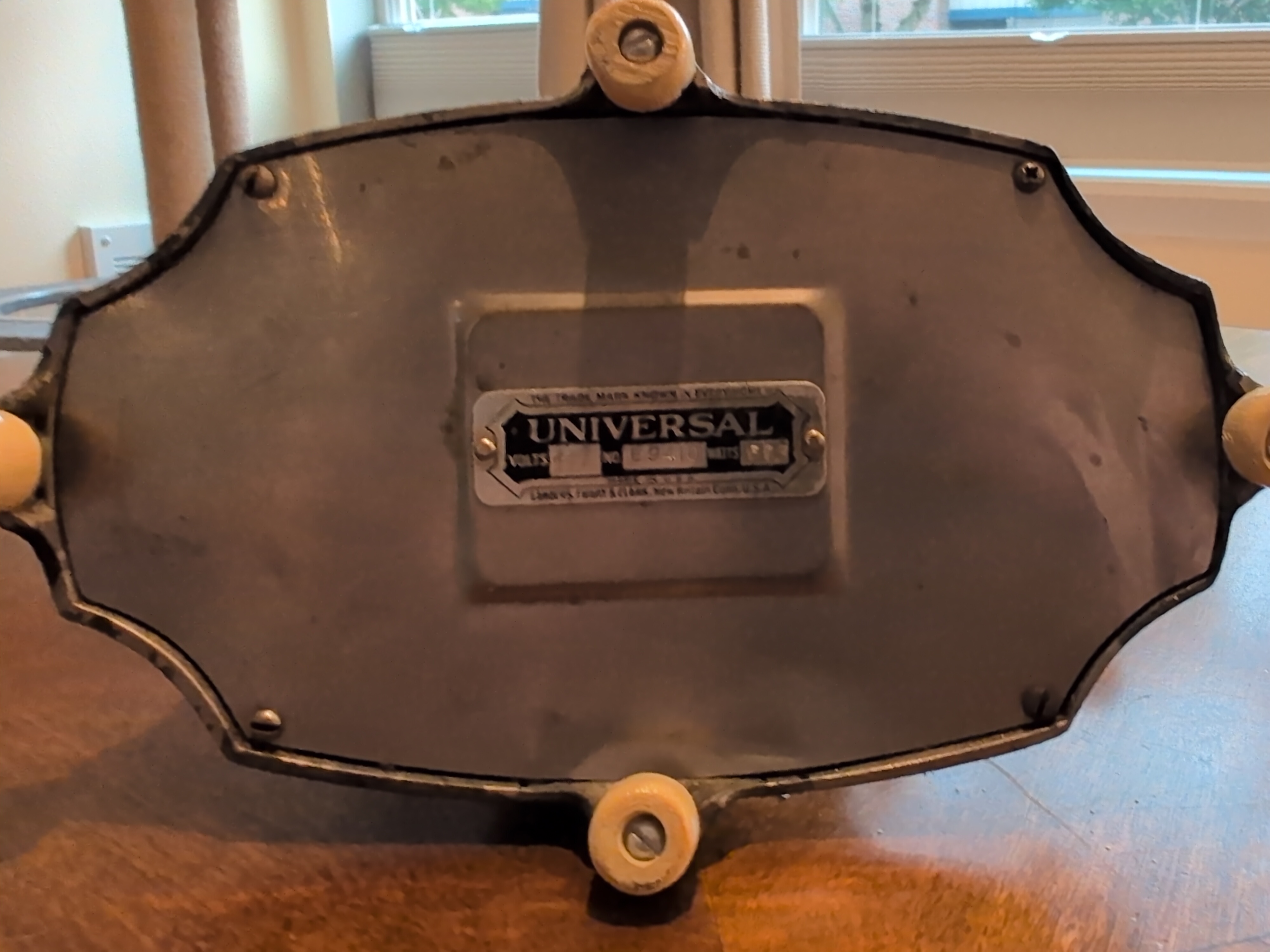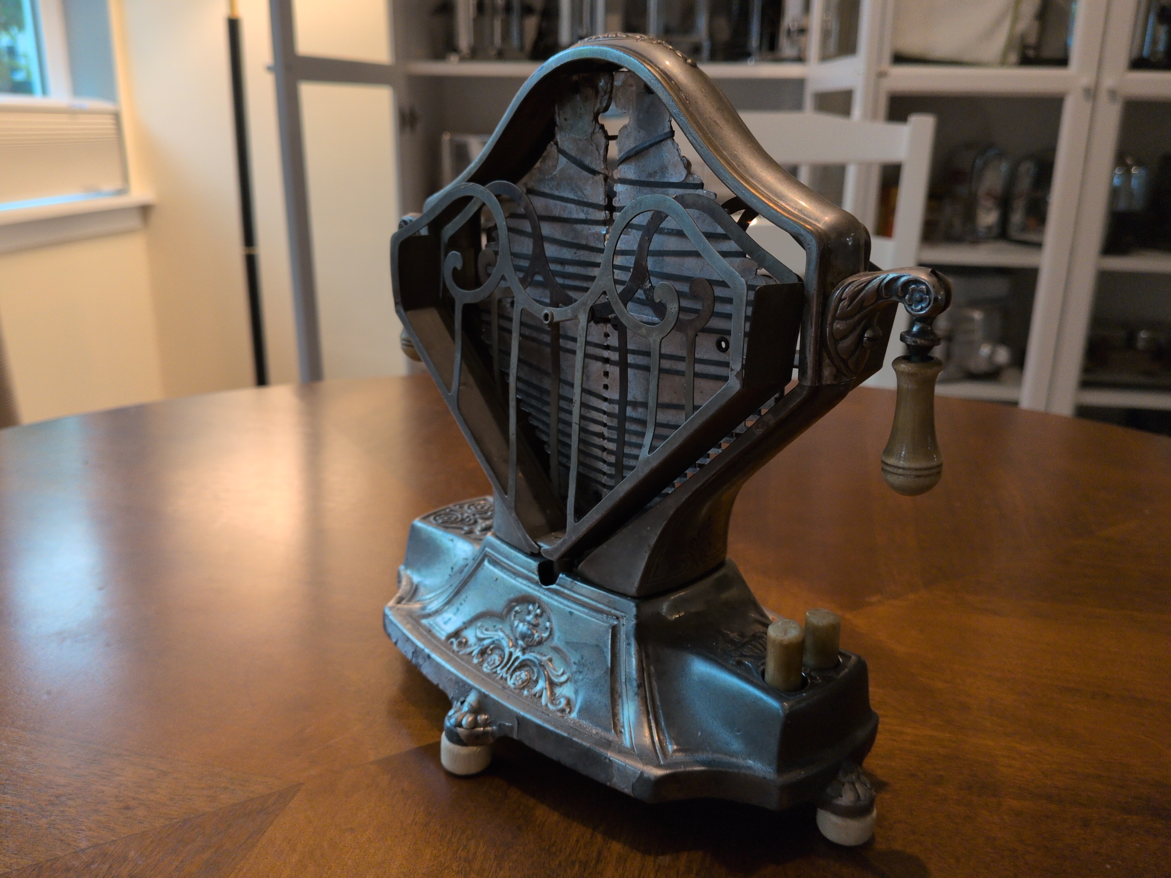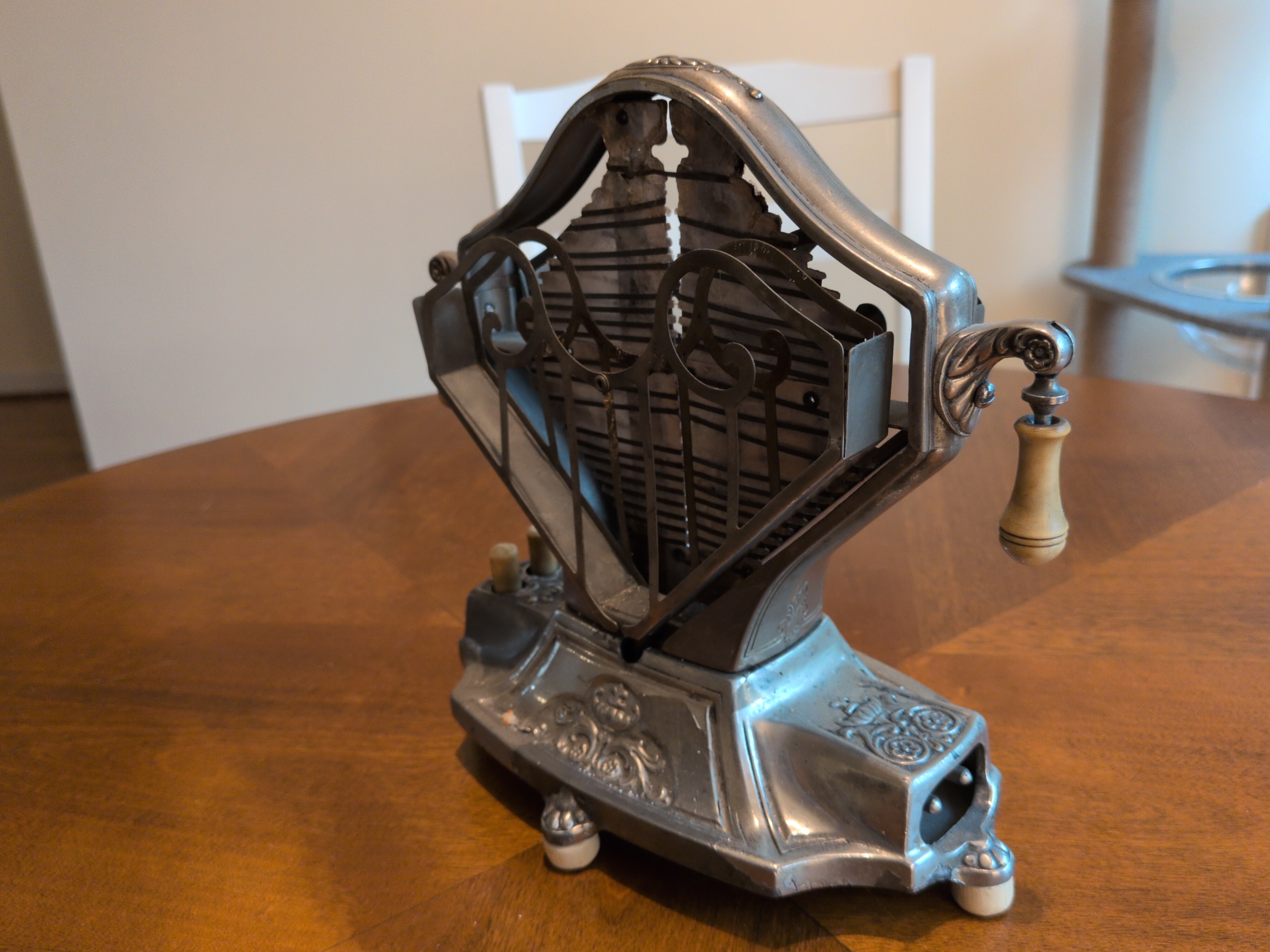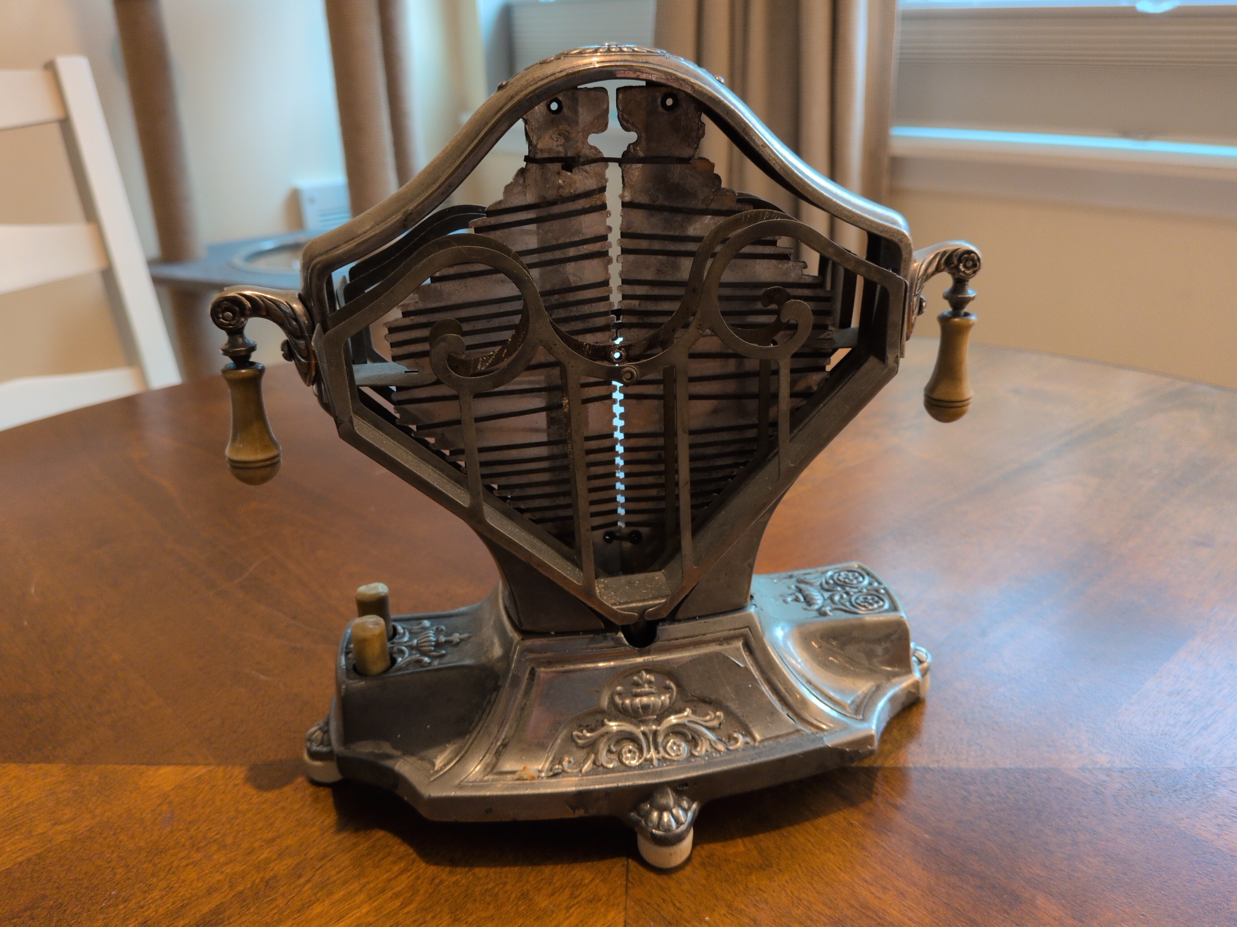 The sweetheart toaster. It was available both with and without the floral embelishments on the base. It was a decidedly lovely toaster, and appears to have sold well. The ivory colored “buttons” on the base cause either toast cage to drop outwards and rotate about its axis, as can be seen in the following video: